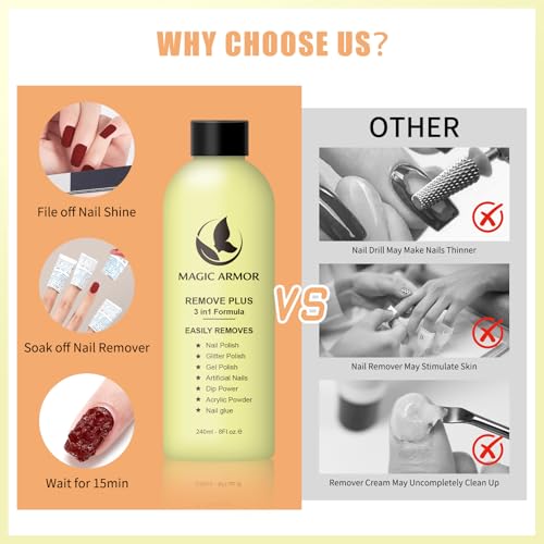 【Quick Removal】MAGIC ARMOR gel polish remover is formulated to gently remove nail polish, glitter or nail glue from your nails. Our formula acts quickly and effectively, removing even the toughest polish